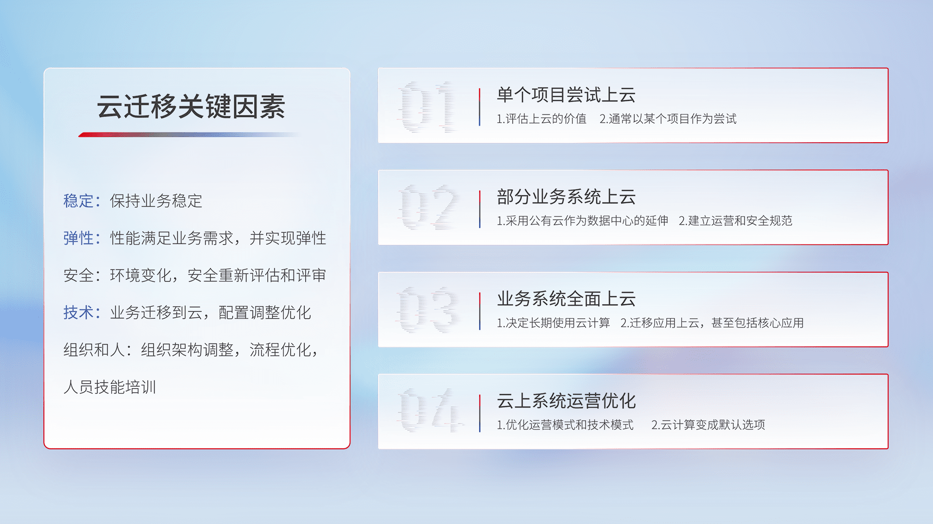 结合实际业务,,,,从规划设计、、云平台选型、、云原生改造、、、数据迁移、、集成交付,,迁移全过程为客户识别最佳上云路径,,,做好风险识别管理,,,,设计网络架构、、身份权限、、安全审计合规、、、、操作审计、、、、日志审计、、监控告警策略、、多站点容灾设计等,,,,对云上基础设施进行整体规划,,提升IT治理水平,,,,以满足弹性、、、高可用、、、高性能的需求。。。。